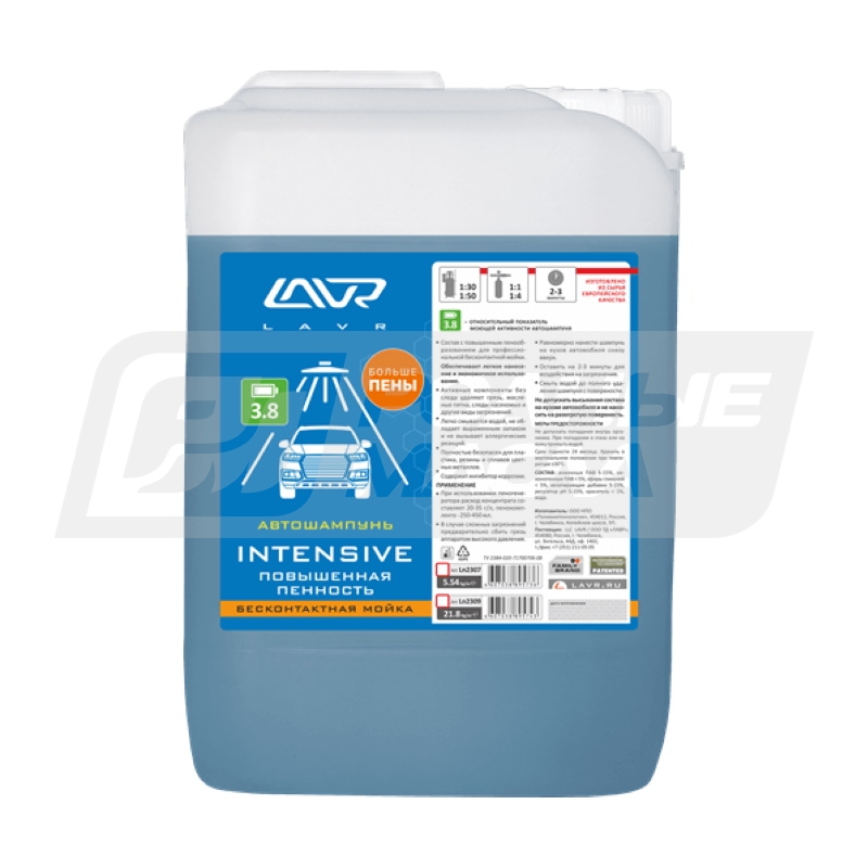 Автошампунь для бесконтактной мойки Intensive LAVR – концентрированное средство для очистки внешних поверхностей автомобилей, мотоциклов, велосипедов и т.д. Состав с высоким пенообразованием размягчает и отслаивает частицы грязи, которые затем легко смываются водой. Безопасен для лакокрасочного и других покрытий.